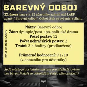 - Barevný odboj (12 hráčů, 3.5h) – setkání odbojové skupiny ve světě bez barev, dystopie a post-apo